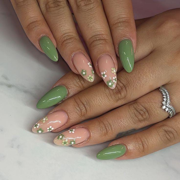 Muted sage green nails alternate with nude bases topped with tiny white and green floral patterns. The overall look is soft, feminine, and effortlessly elegant for March spring feel.