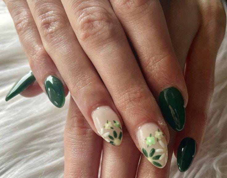 Rich forest green polish contrasts beautifully with creamy nude accent nails featuring subtle leafy florals. It gives off a cozy yet refined March spring vibe with a touch of depth.