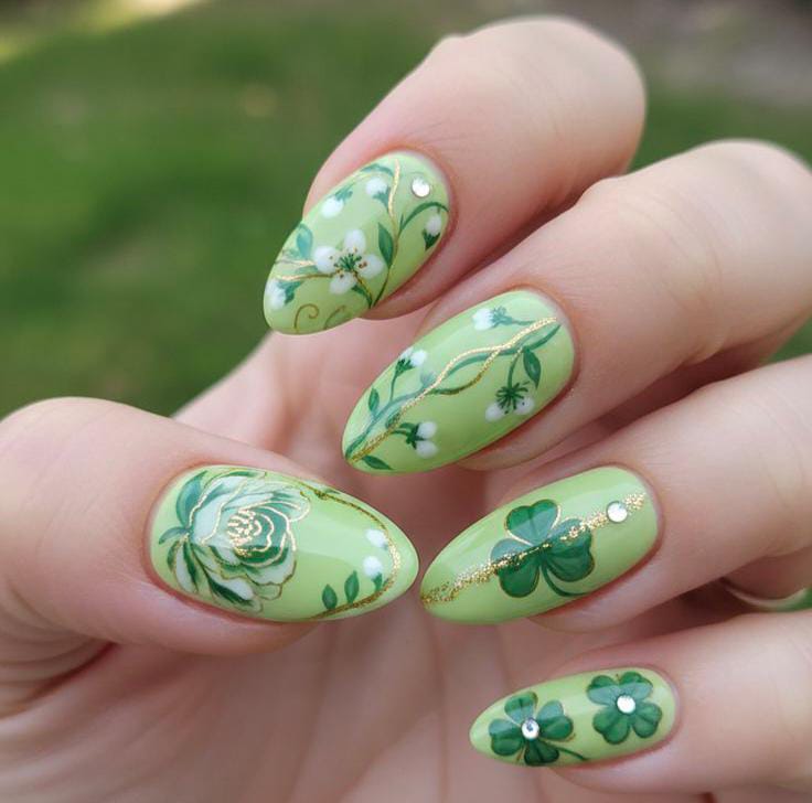 This bright green manicure features hand-painted florals, leaf and clover accents with delicate gold swirls. It feels festive, fresh, and perfect for celebrating the spirit of March.