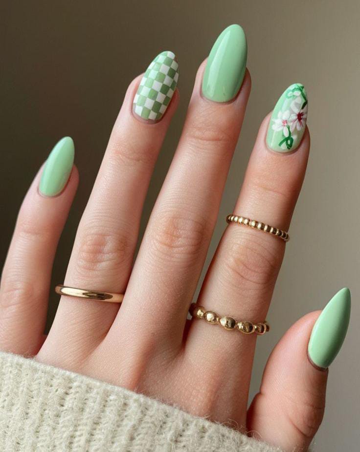 This design features soft mint green nails paired with a chic checkerboard accent and delicate white floral art. The glossy finish and almond shape give it a fresh, playful March spring vibe.