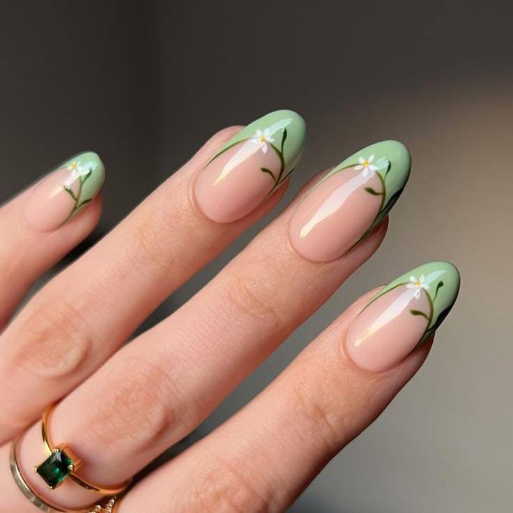 A modern sage green French tip sits over a nude base, accented with tiny white flowers and thin leafy details. It feels light, elegant, and perfectly suited for a soft March spring look.