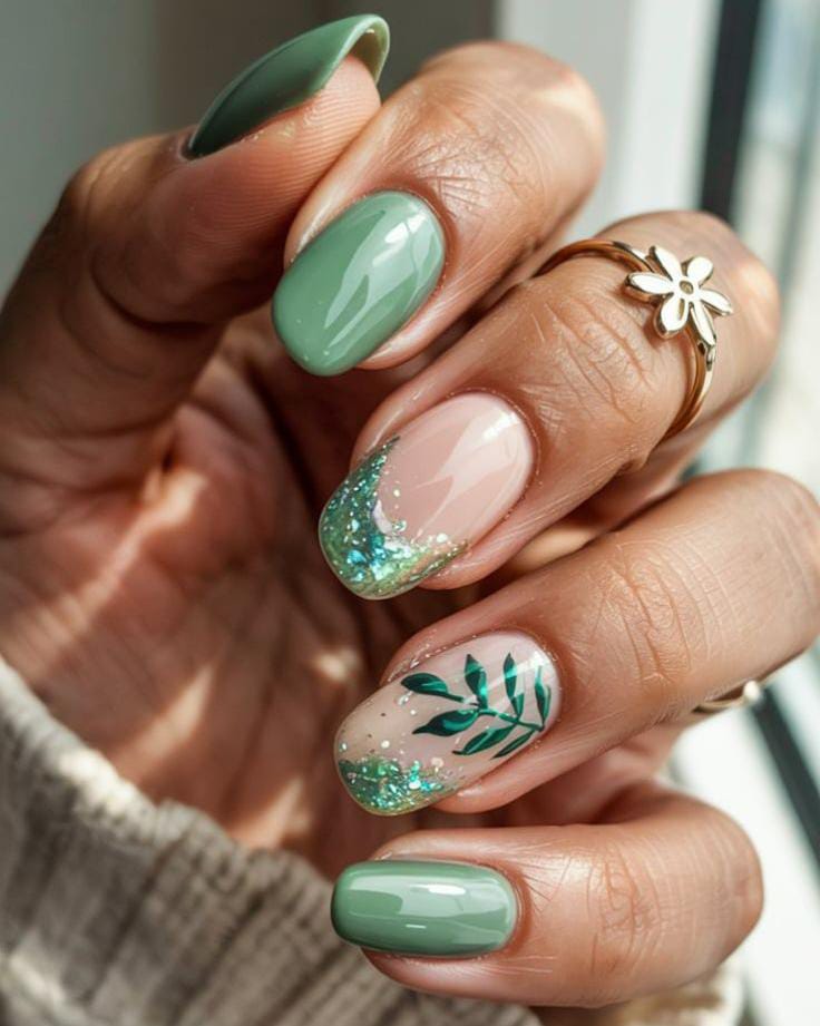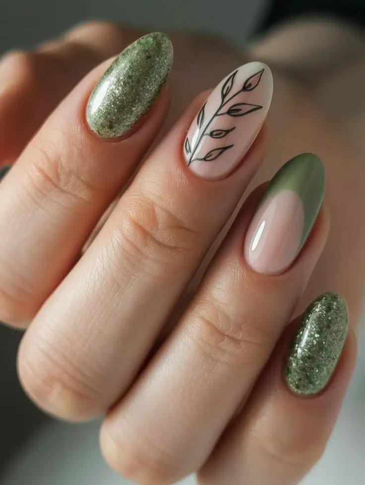 Muted green nails are combined with nude accents, leafy designs, and a touch of green glitter along the tips. The overall style is fresh and spring-inspired with a subtle hint of shimmer.