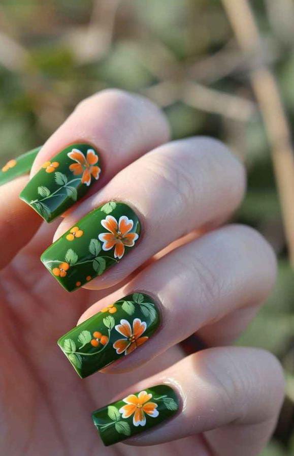 These nails feature a rich forest green base with hand-painted orange flowers and leafy details. The look is bold, fresh, and full of lively March spring energy.