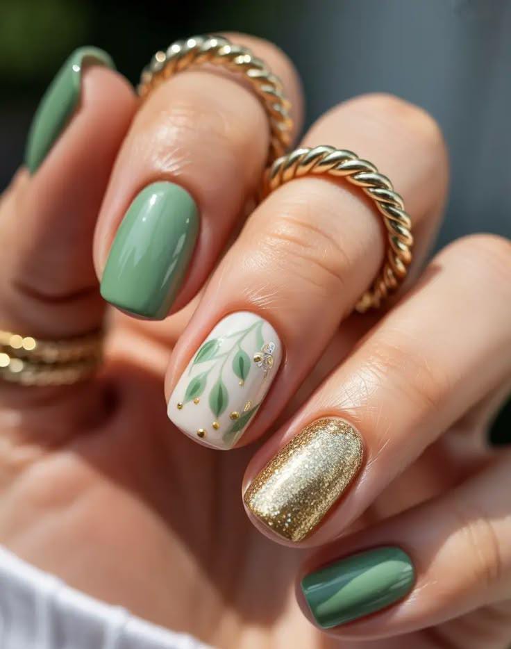 Rich olive green nails are mixed with botanical cream accents and a bold gold glitter statement nail. The glossy texture and gold details create a classy yet earthy March spring aesthetic.