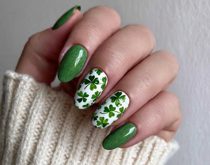 Glossy medium-green nails are paired with white accent nails covered in bright shamrock patterns for a festive March spring feel. The look is playful, fresh, and perfect for a subtle St. Patrick’s vibe.