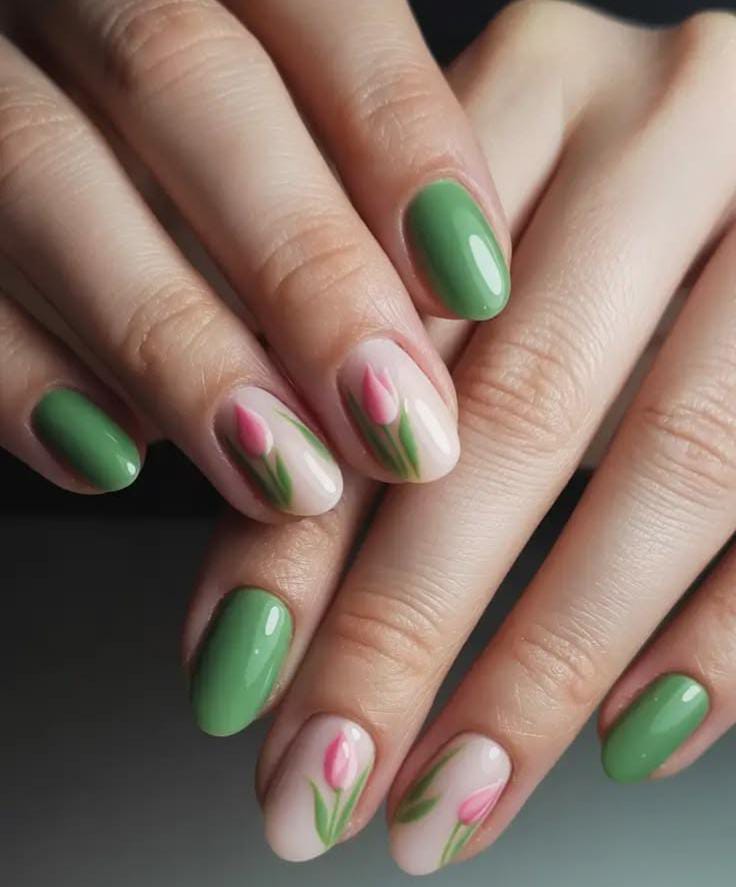 Soft green nails are complemented by nude accents featuring delicate pink tulip designs. The overall style feels clean, floral, and beautifully suited for early March spring.