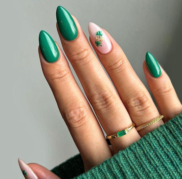 Deep glossy green nails are paired with a soft nude accent featuring tiny shamrocks and subtle gold details. The look is sleek, festive, and perfect for a chic March spring statement.