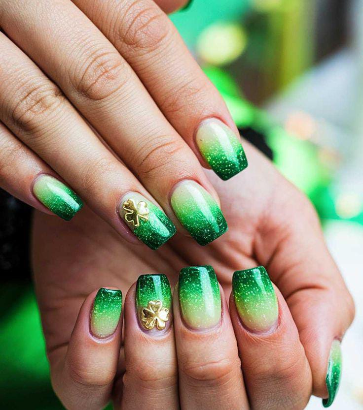 A sparkling green ombré fades from soft nude to rich emerald with a dusting of glitter. Gold clover accents add a festive, lucky March spring vibe.