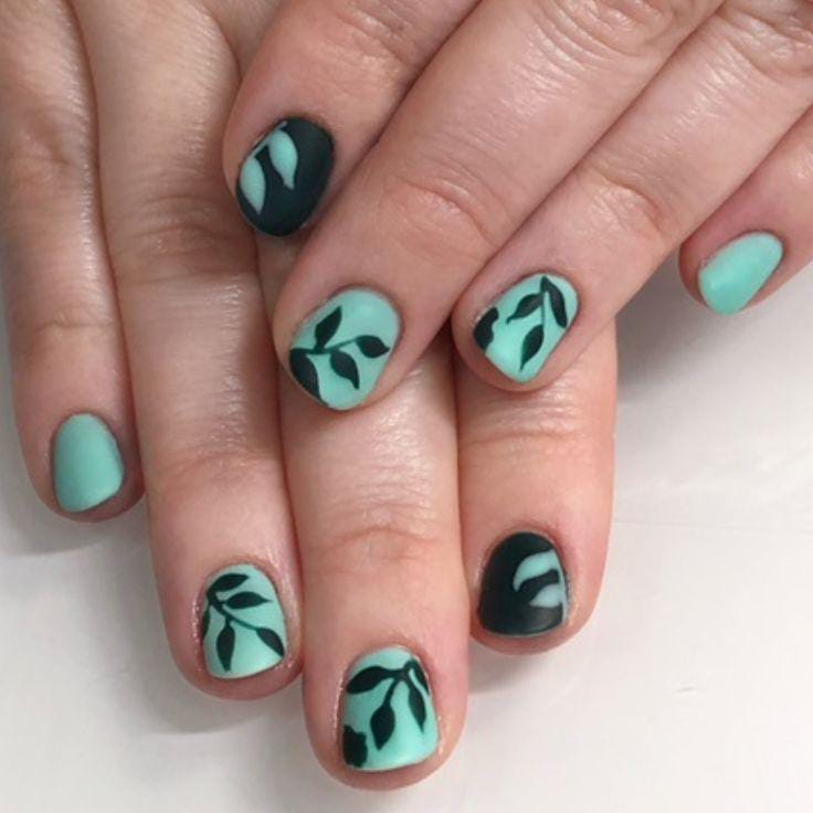 Matte mint and deep green shades alternate for a bold contrast. Minimal leafy patterns add a trendy, nature-inspired March spring aesthetic.