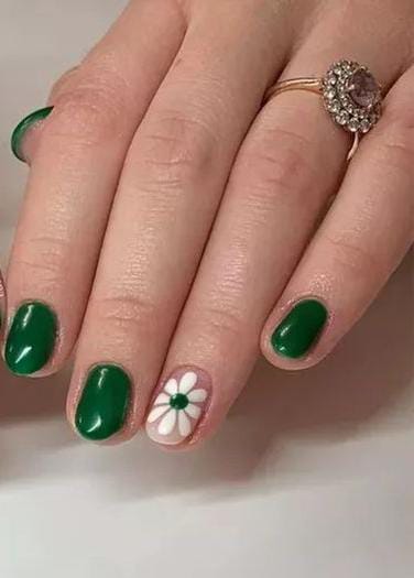 Rich green nails are complemented by a soft accent nail with a delicate white daisy design. The look is clean, minimal, and adds a sweet spring touch to classic March green.