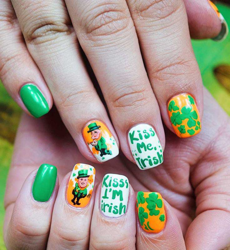 This playful design mixes bright green and orange nails with shamrocks, leprechaun art, and bold “Kiss Me, I’m Irish” lettering on white accents. It’s festive, colorful, and full of cheerful St. Patrick’s Day March energy.