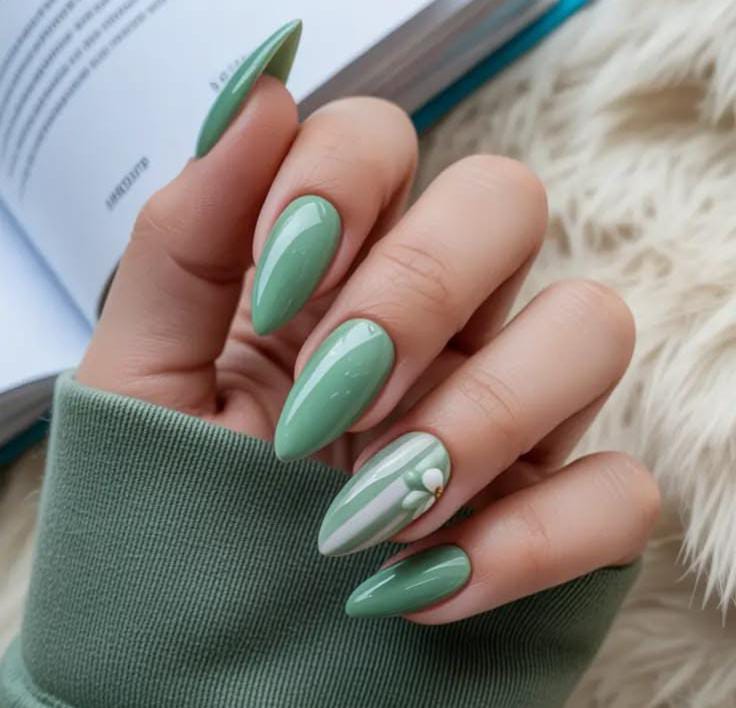 Glossy sage green almond nails are styled with a subtle striped accent and a tiny white floral detail. The vibe is clean, modern, and softly inspired by early March spring.
