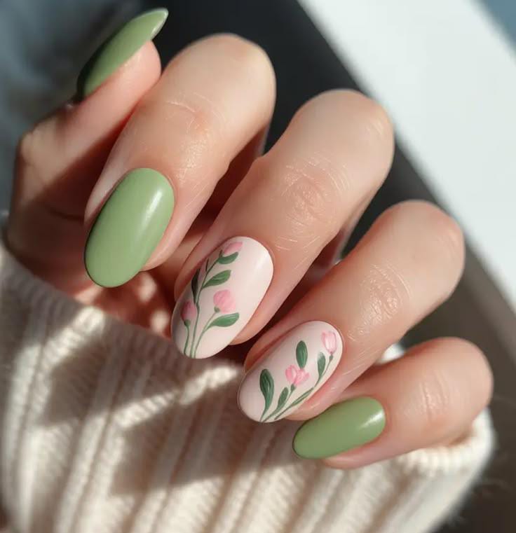 Muted sage green nails are combined with blush accent nails decorated with small pink floral stems. The overall style is light, airy, and softly feminine early March spring feel.