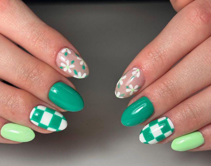 This design has mint and deep green shades with daisy accents and bold checkerboard patterns. It feels fun, trendy, and perfect for a playful March spring vibe.