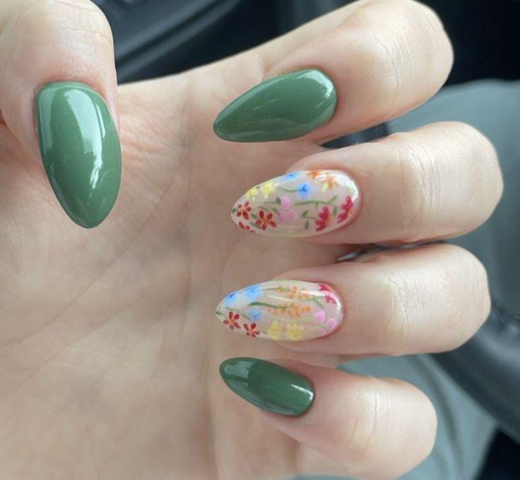 Rich forest green nails contrast beautifully with sheer floral accent nails filled with colorful tiny blooms. The design feels earthy, vibrant, and full of March spring energy.