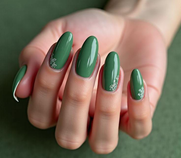 These nails feature a glossy deep green base with tiny white floral details near the cuticles. The look is sleek, simple, and softly elegant for March early spring.