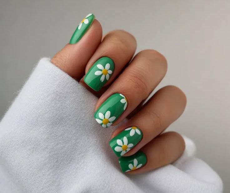 A rich grassy green base is paired with simple white daisy accents for a fresh, cheerful look. The design feels bright, playful, and perfect for welcoming March early spring.