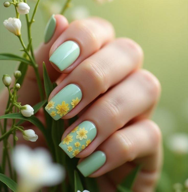 Soft mint green nails are decorated with tiny yellow floral details for a delicate, feminine touch. The overall vibe is light, airy, and beautifully March spring-inspired.