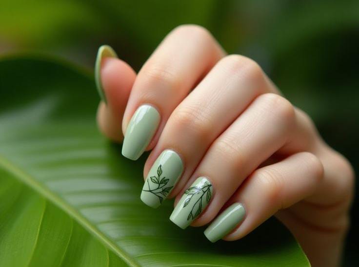 Muted sage green nails feature subtle leafy branch art that adds a calm, natural feel. The look is clean, minimal, and effortlessly elegant March spring energy.