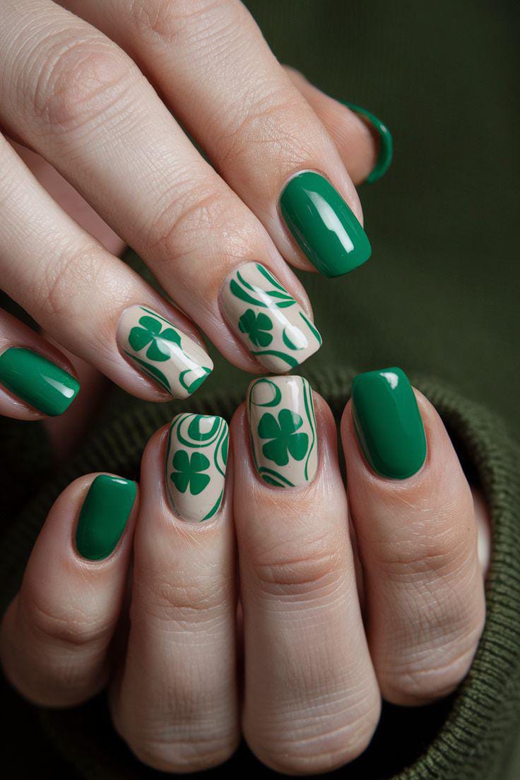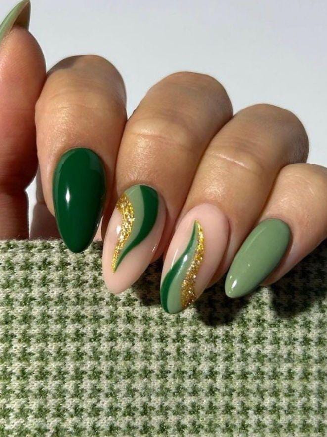 Deep green and nude tones are paired with flowing gold glitter lines for a modern, elegant look. It feels polished and stylish with a St. Patrick’s Day festive twist.