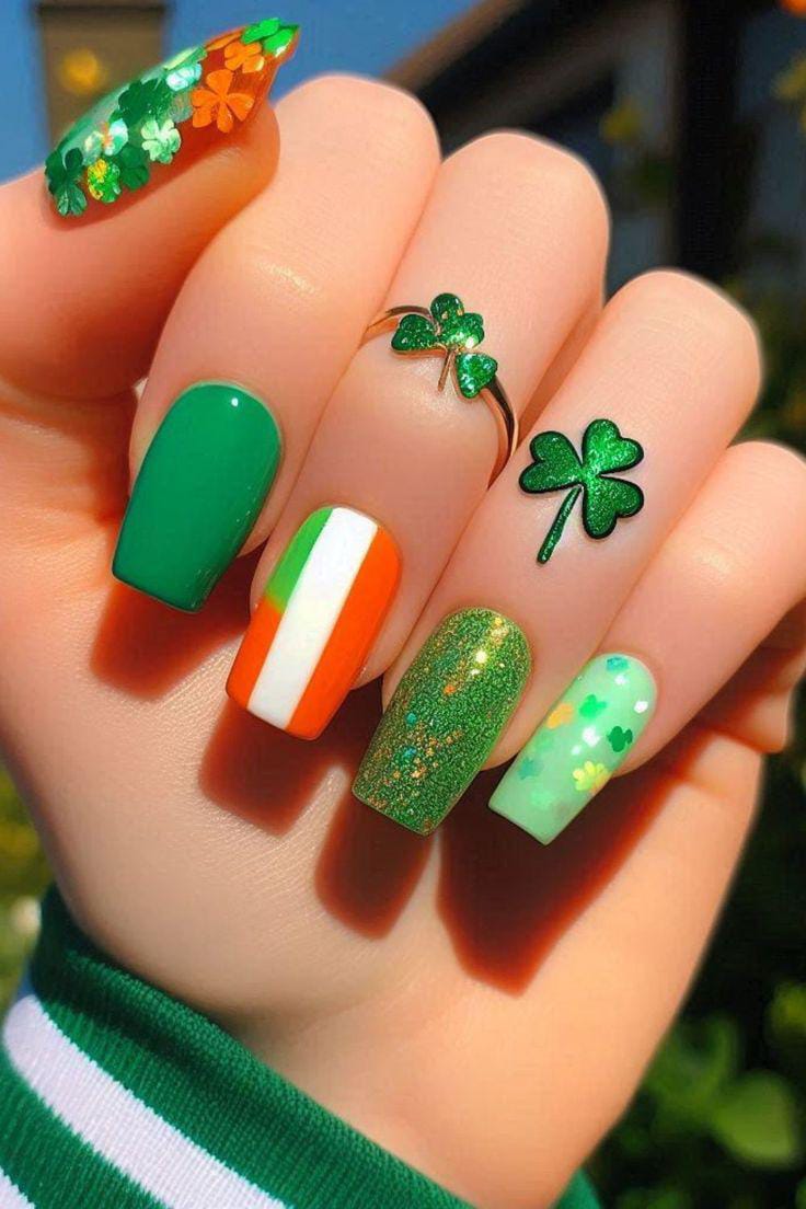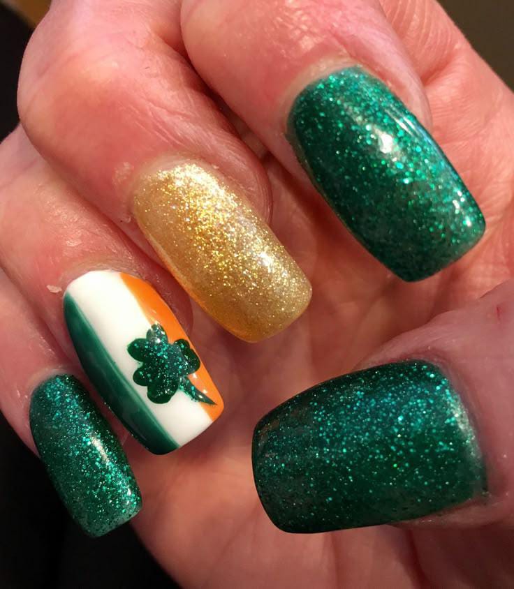 This set combines rich green glitter with a gold accent nail and a tricolor Irish flag-inspired design. The vibe is festive, playful, and perfect for St. Patrick’s Day celebrated in style