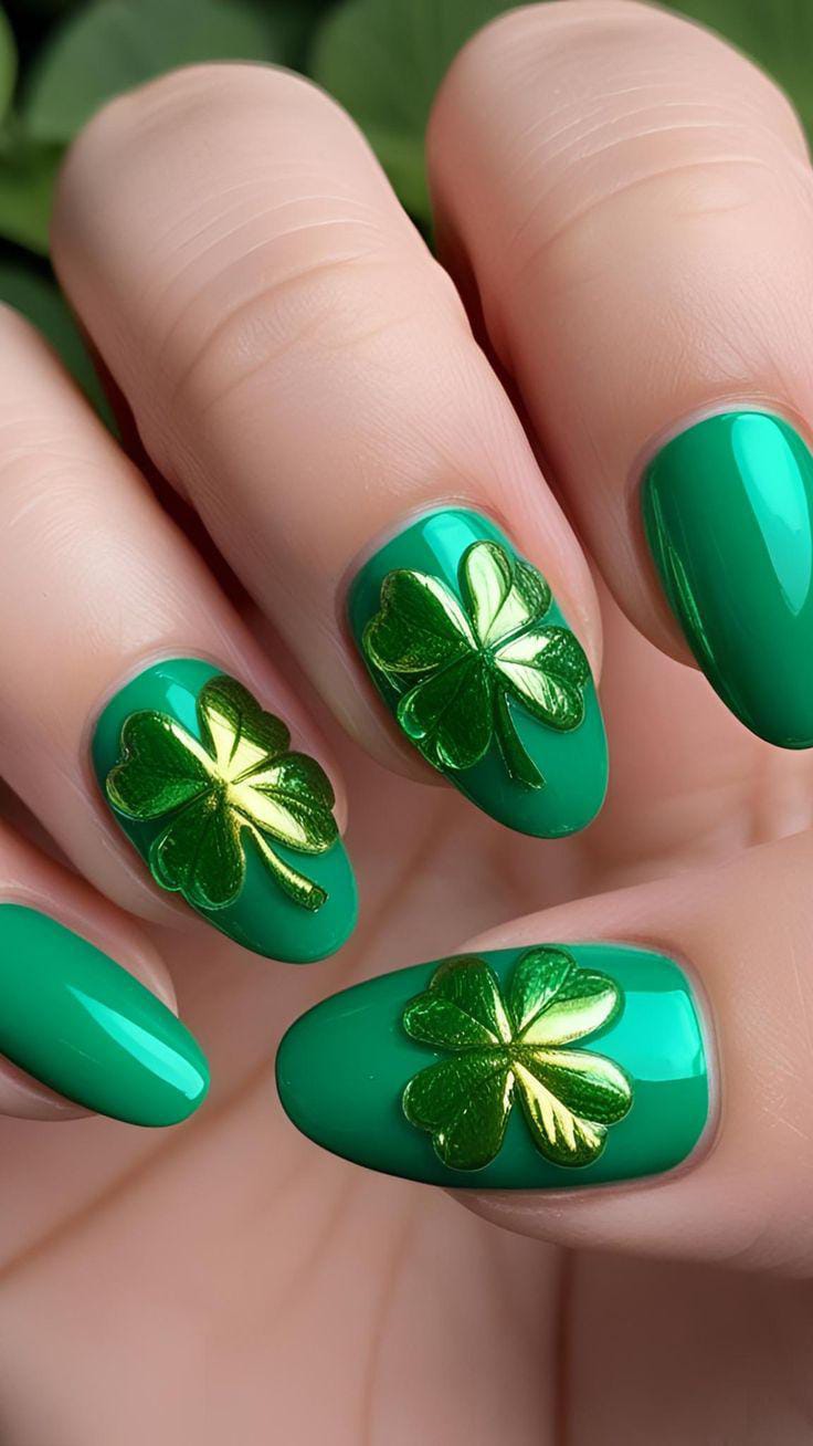 Shiny emerald green nails are paired with raised metallic shamrock details for a sleek, eye-catching finish. The overall look is classy, vibrant, and very St. Patrick’s Day-inspired.