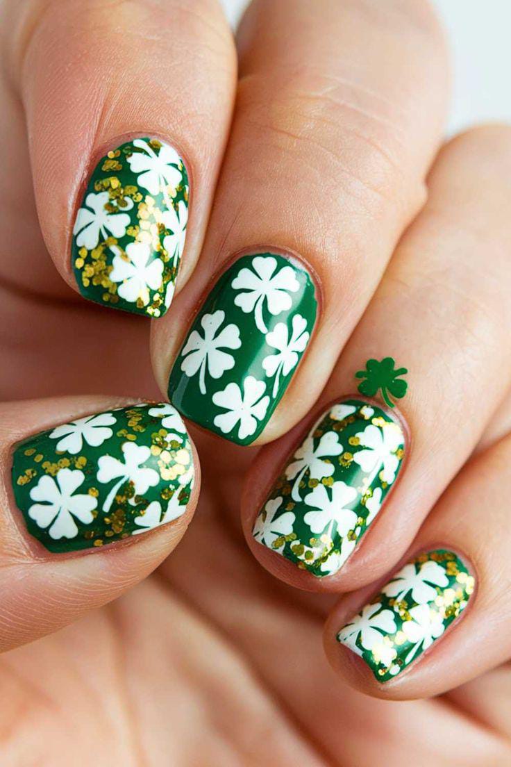 Deep green nails are covered with crisp white shamrocks and scattered gold glitter, giving a festive, party-ready look. The overall vibe is bold, cheerful, and perfect for St. Patrick’s Day celebrations.