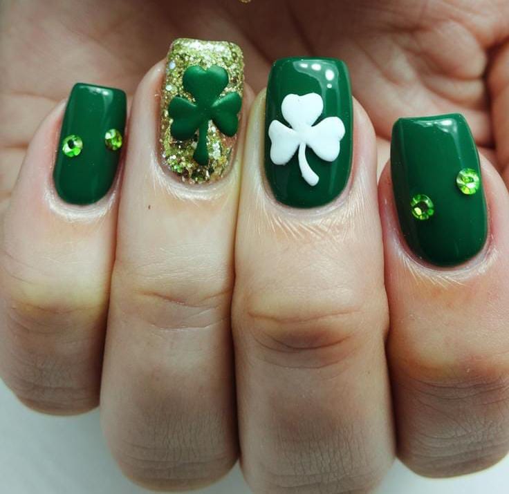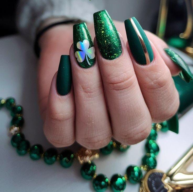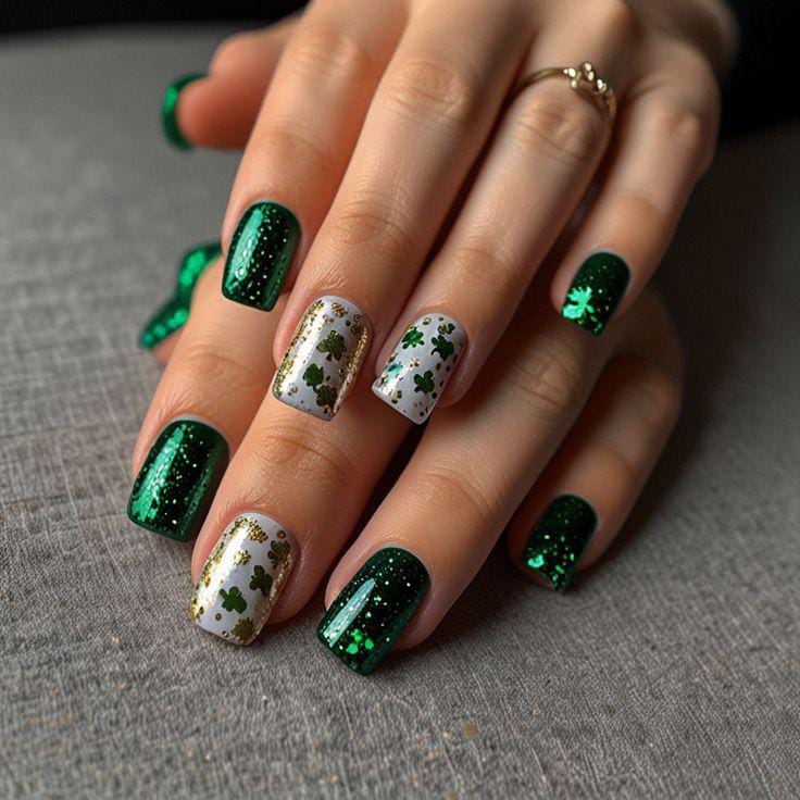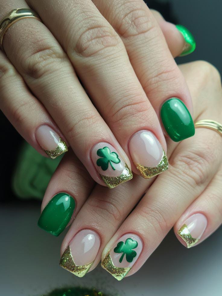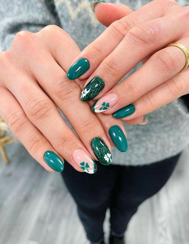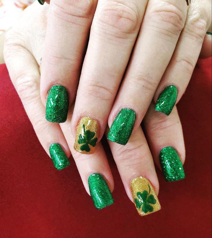 Deep emerald green nails mix with gold glitter accents and shamrock designs. The look feels rich, glamorous, and very on-theme for St. Patrick’s Day.
