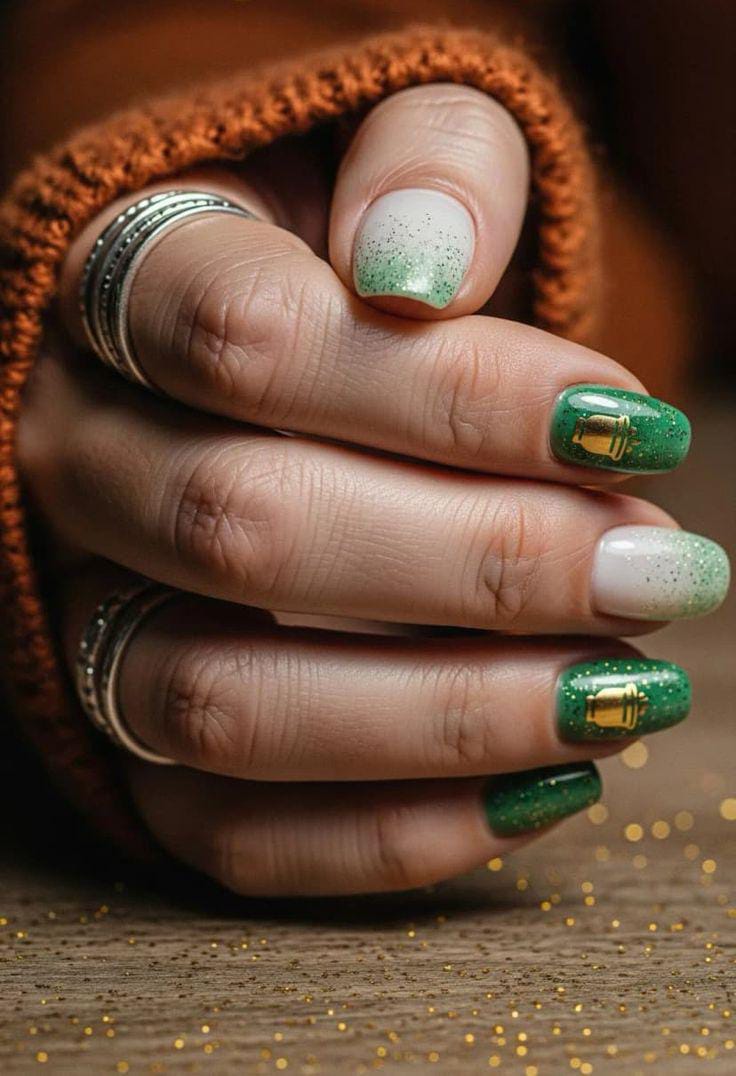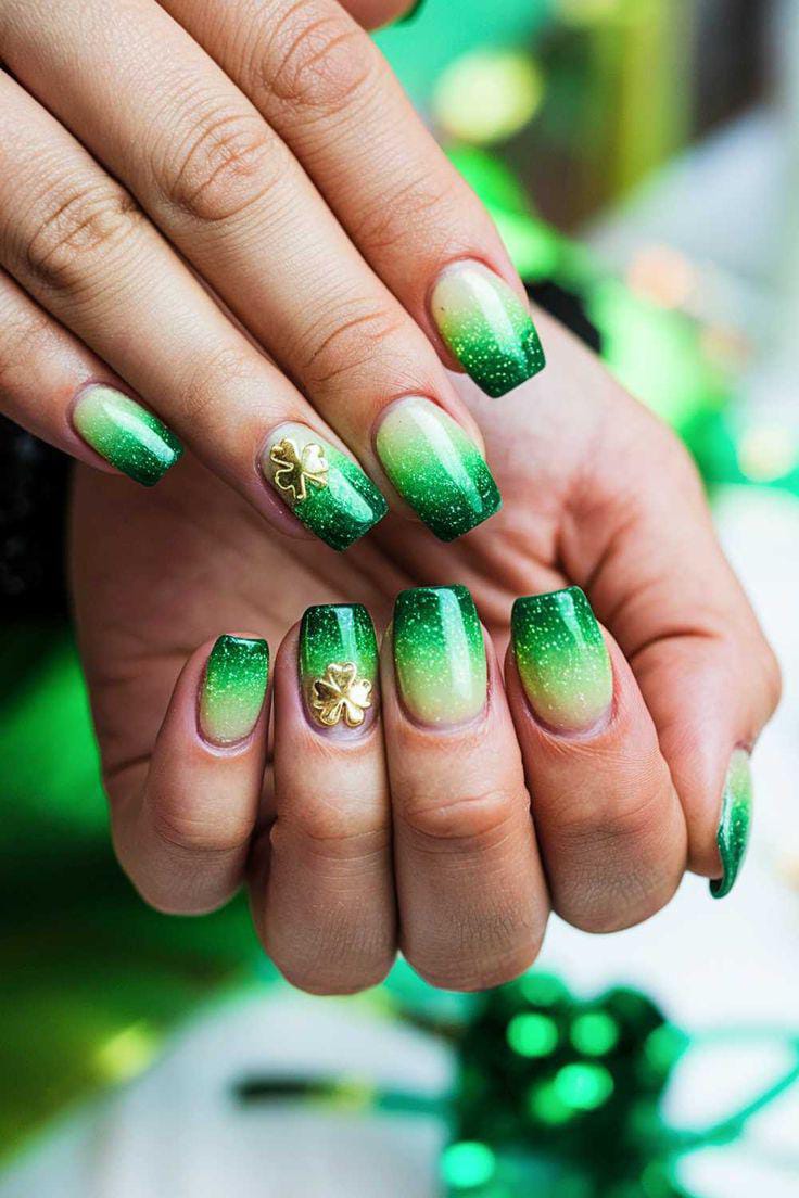 Green ombré nails fade from light to deep emerald with a touch of sparkle and small gold clover accents. The style feels glamorous yet playful, giving a lucky, magical St. Patrick’s Day mood.
