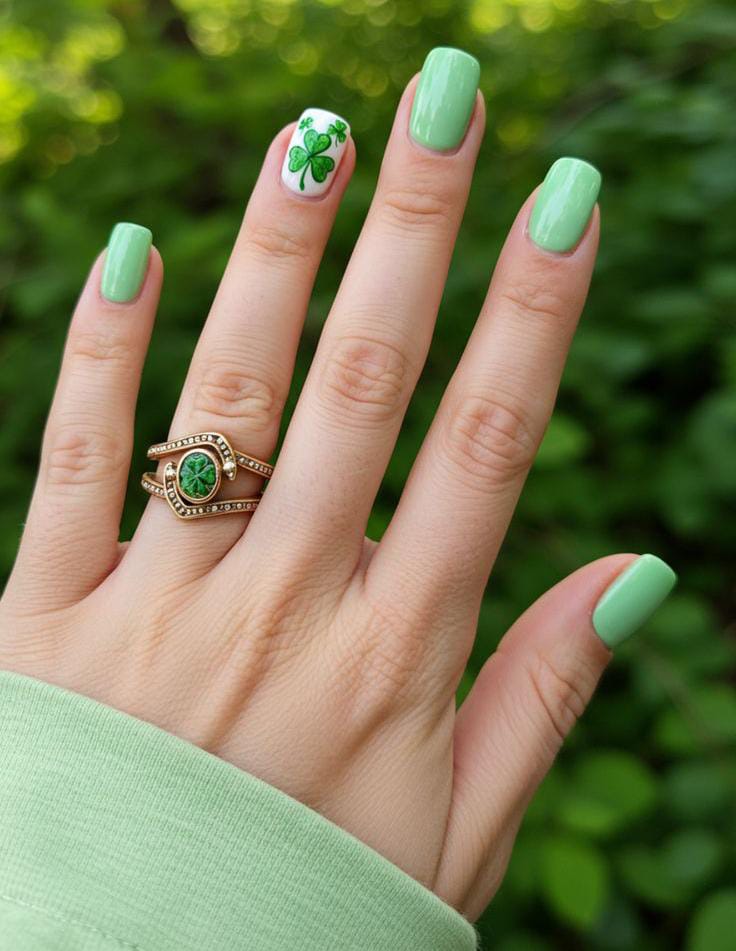 Fresh mint-green nails keep things clean and simple, with one cute clover white accent for a St. Patrick’s Day festive touch. The overall look feels light, airy, and perfect for a soft spring vibe.