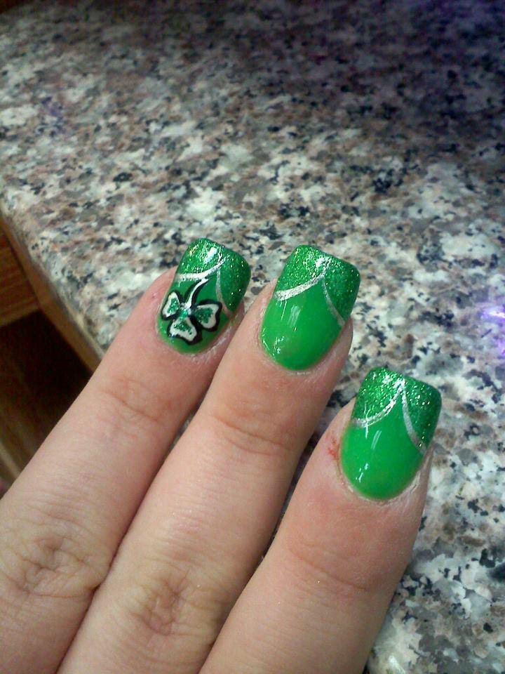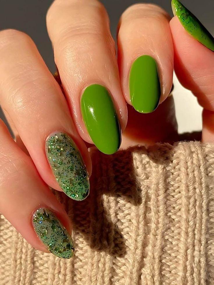 Bright green glossy nails are paired with a glittery accent nail that adds texture and shine. The overall vibe is fresh, playful, and eye-catching St. Patrick’s Day while still feeling clean and polished.
