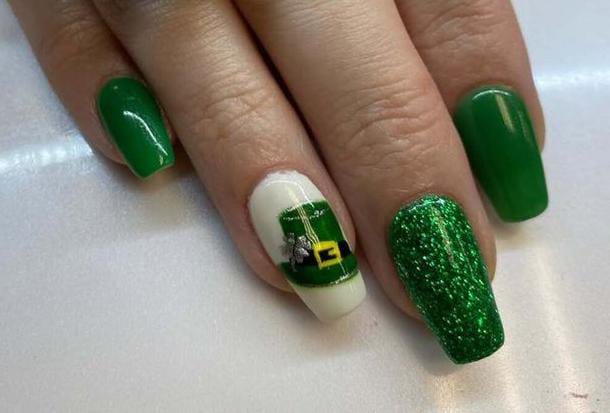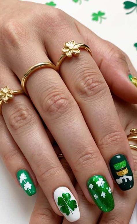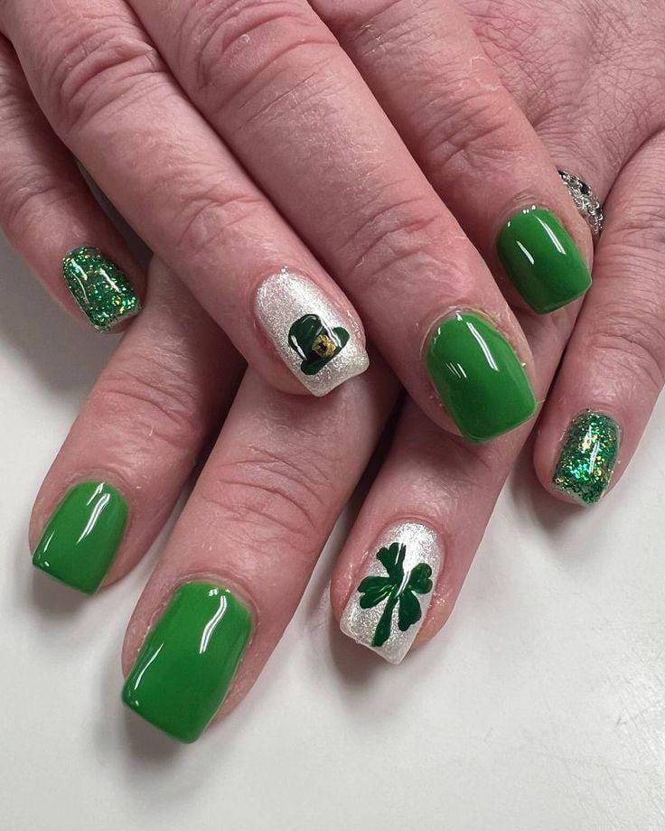 Rich green nails are mixed with themed accent nails featuring a leprechaun hat and a shamrock on white base. The style feels bold and festive, giving full St. Patrick’s Day celebration energy.