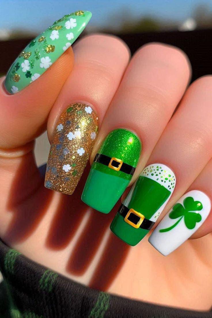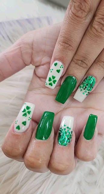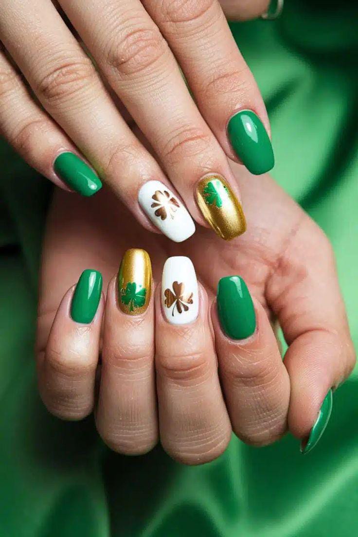 This set combines rich green nails with white and gold accent nails featuring gold shamrock designs on white base. The overall style feels elegant and festive, with a St. Patrick’s Day touch of luxury from the metallic gold finish.
