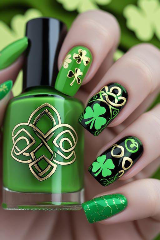 Deep green and black nails are decorated with gold Celtic-style patterns and shamrocks. The look feels classy, detailed, and a bit luxurious for St. Patrick’s Day.