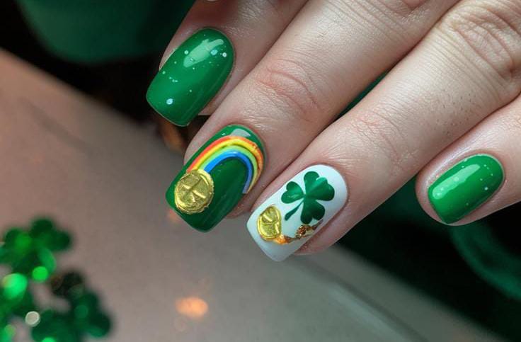 This design mixes glossy green nails with playful St. Patrick’s Day white accents like rainbows, shamrocks, and gold coin details. The overall vibe is festive, cheerful, and a little whimsical with bright pops of color.