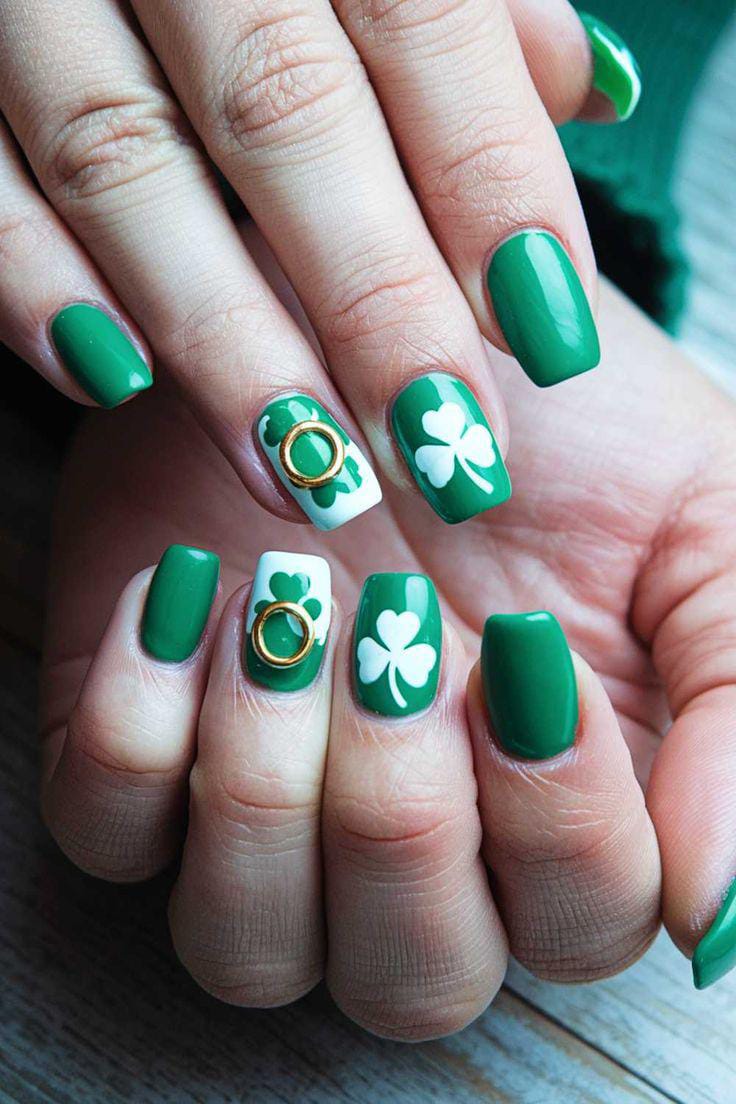 Glossy green nails are paired with white accent nails featuring bold shamrock shapes and subtle gold ring details. The look is clean, modern, and stylish while still clearly St. Patrick’s Day themed.