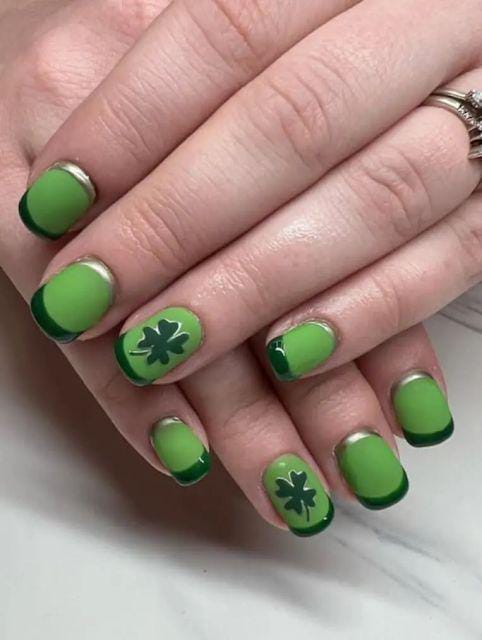 Light green nails with darker green French tips create a soft and modern look, finished with cute shamrock accents. The design feels fresh, minimal, and stylish with a gentle festive St. Patrick’s Day touch.