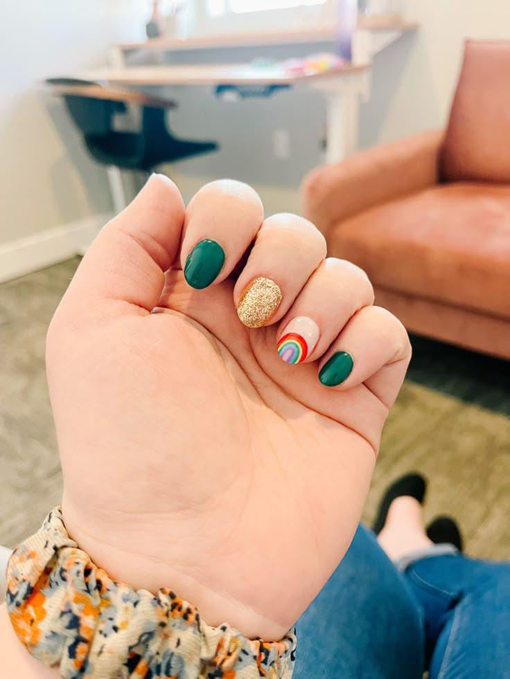 Muted green nails are paired with a gold accent and a small rainbow detail on nude base for a playful St. Patrick’s Day twist. The vibe is modern, cozy, and lightly festive without being over-the-top.