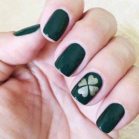 Deep green nails paired with simple metallic clover shapes create a bold yet clean St. Patrick’s Day look. The design feels classic and playful, with strong holiday energy.