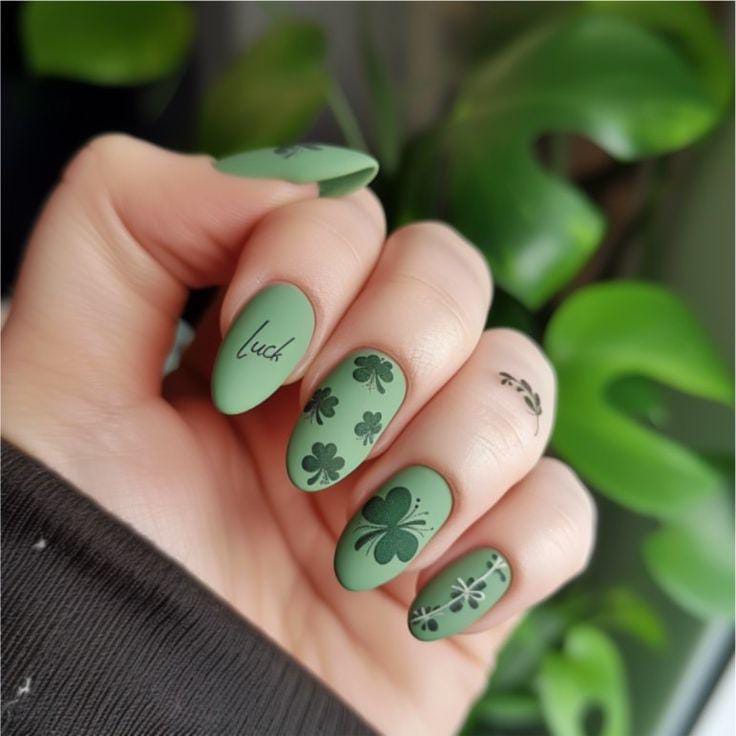 These nails use a muted sage green base with delicate clover patterns and subtle botanical details. The overall look feels calm, cozy, and slightly whimsical, perfect for a relaxed festive St. Patrick’s day style.