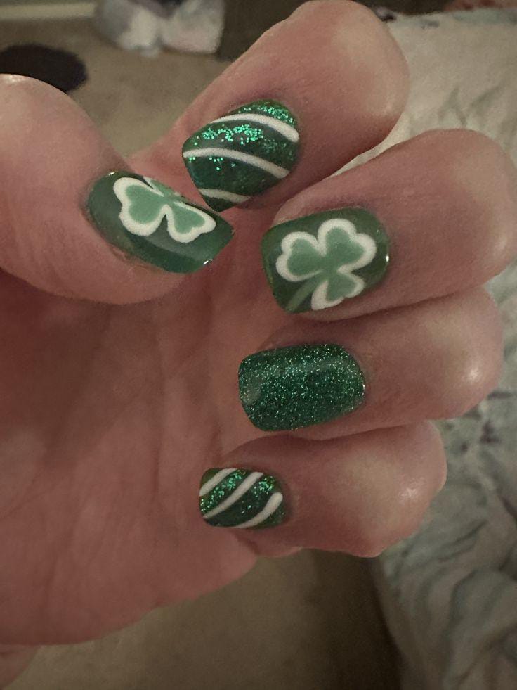 This design is dark green glitter nails with soft white swirls for a bold, festive look. The clover shapes pop nicely and give the set a cozy, St. Patrick’s holiday-ready feel.