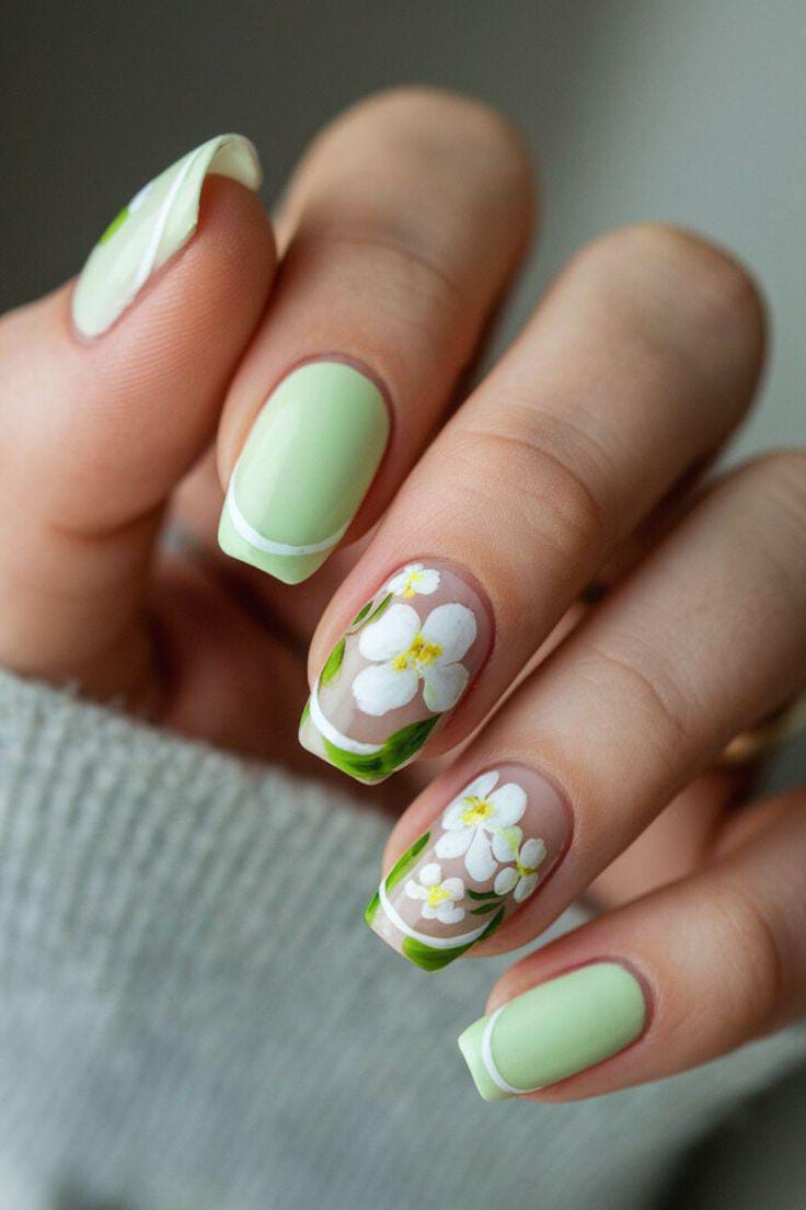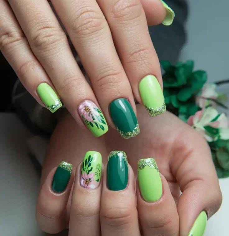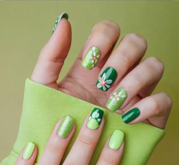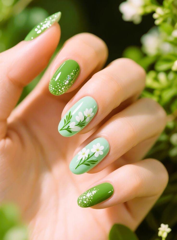 A mix of soft mint and vibrant green nails with white floral, green leaf art and light glitter accents creates a lively summer look. The design feels cheerful, fresh, and inspired by blooming greenery.