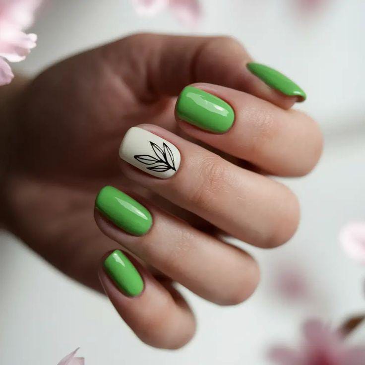 This design features glossy green nails paired with a soft cream accent nail, creating a clean and refreshing summer look. The simple black leaf detail adds a natural, minimal vibe that feels light, modern, and effortless.