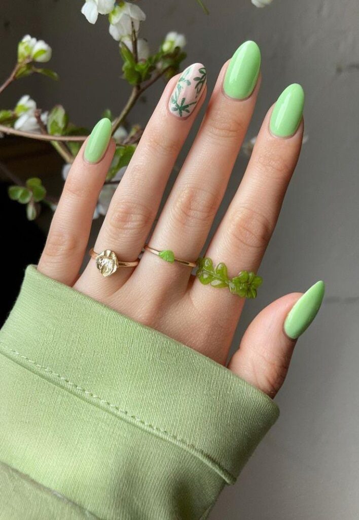 A smooth mint-green manicure with a clean, glossy finish and a subtle botanical nude accent nail. It has a calm, airy vibe that feels light, modern, and perfect for everyday summer wear.
