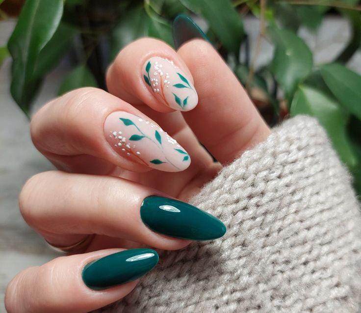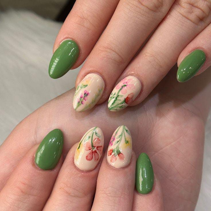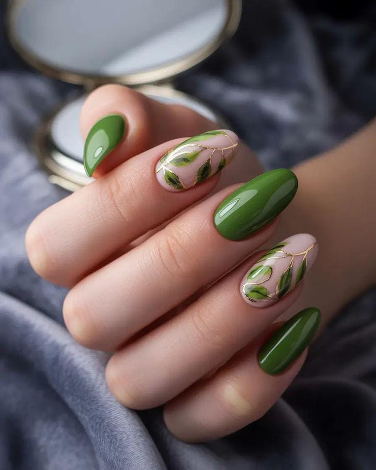 Deep leafy green nails are paired with nude bases featuring hand-painted floral and green branches details. The design feels elegant yet natural, inspired by blooming gardens and warm summer afternoons.