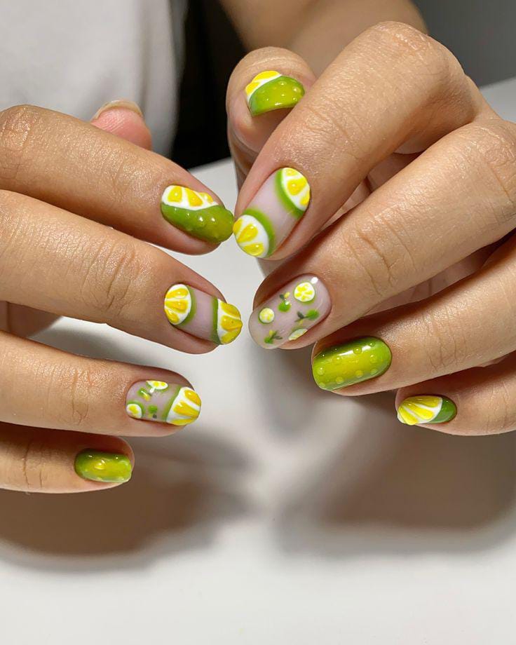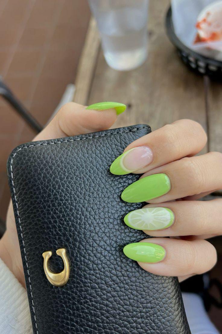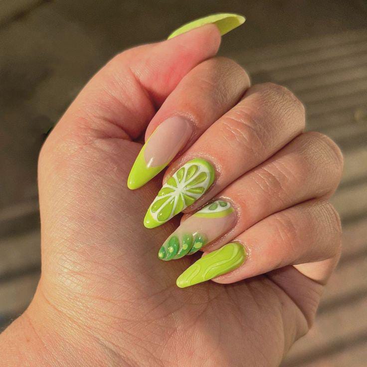 Bright lime green nails are combined with sheer nude accents and playful floral, leaf and lime slice details. The design feels lively, youthful, and full of fresh summer energy.