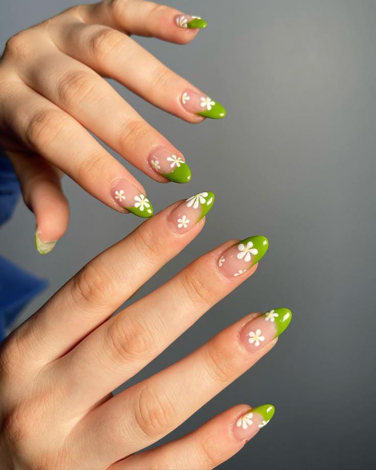 This design features a soft nude base with bright green French tips, decorated with tiny white daisy flowers. The look feels light, playful, and perfect for a sunny, carefree summer vibe.