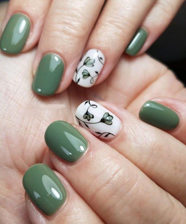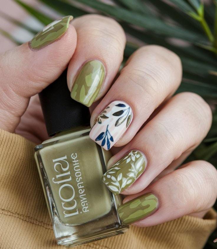 Muted olive green nails are paired with minimal white accent nails featuring floral and fine vine artwork. This design feels classy, modern, and slightly earthy—perfect for a chic summer style.