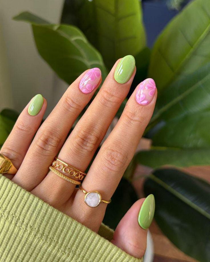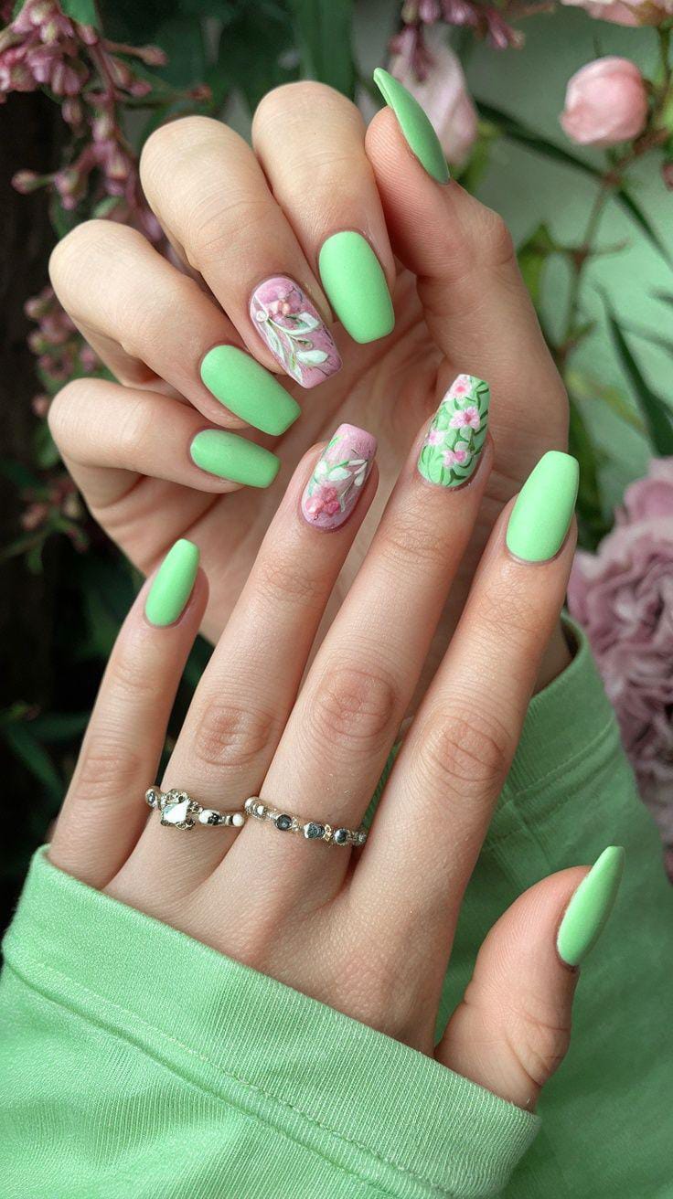 This set combines matte mint-green nails with soft pink floral accent nails. The design feels fresh, feminine, and very spring-to-summer inspired with a gentle, romantic touch.