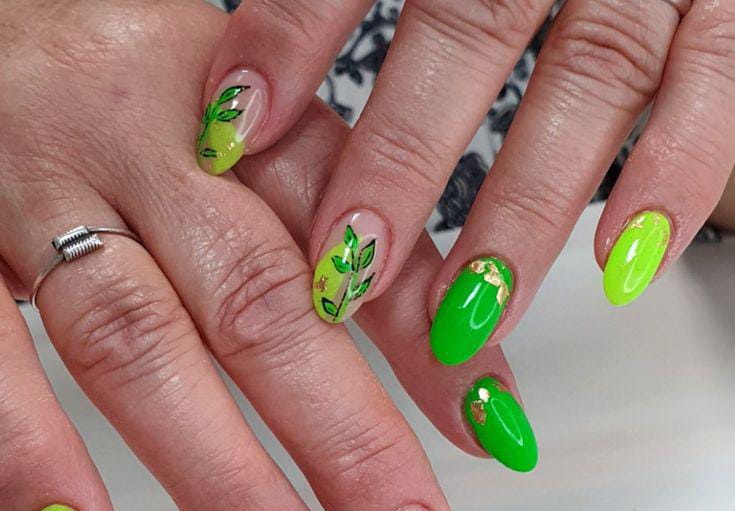 Bright green, neon and nude nails dominate this bold design, mixed with simple leafy patterns and gold foil for a playful touch. It feels vibrant, energetic, and ideal for making a statement during summer days.